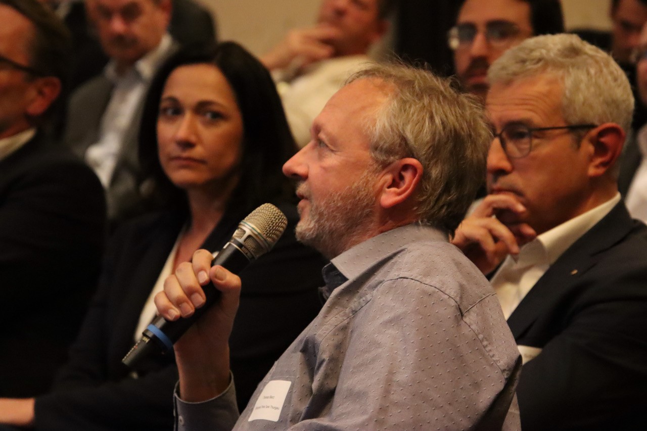 Werner Fritschi (Leiter Markt bei der Regionalbahn Thurbo AG und Präsident Thurgau Tourismus) machte im Gespräch mit Dr. Roland Scherer und Regula Broger (Vizepräsidentin des Stiftungsrats Think Tank Thurgau) deutlich, dass der ÖV nur ein Baustein im Mobilitätsangebot sein kann. Als Mobilität der Zukunft wünscht sich Fritschi ein Verständnis von Mobilität als Gesamtpaket, eine Plattform mit niederschwelligen Angeboten unterschiedlicher Mobilitätsanbieter. Die Bahn wäre nur ein Element, das beispielsweise um Sharing-Angebote ergänzt werden kann. Den Kundinnen und Kunden ist es wichtig, sich möglichst einfach, komfortabel und preiswert im Raum bewegen zu können und dabei auf das für sie und ihre Anforderungen beste Mobilitätsmittel zugreifen zu können. Insbesondere in der Bodenseeregion braucht es dafür Kooperationen, um grenzüberschreitend ein attraktives Angebot bereitstellen zu können.