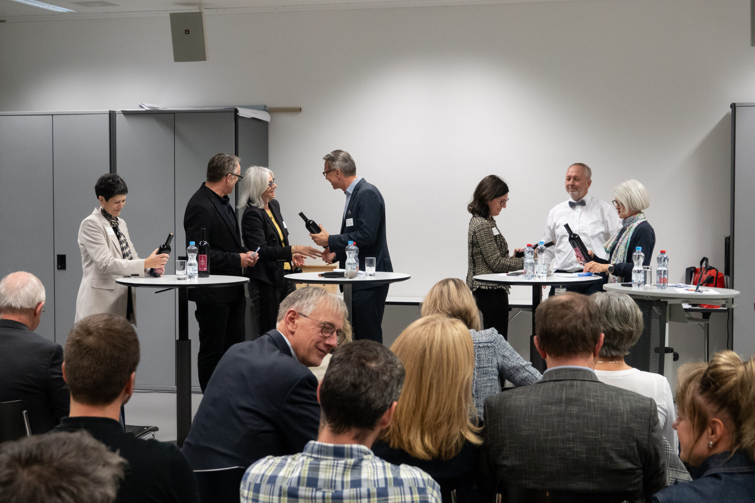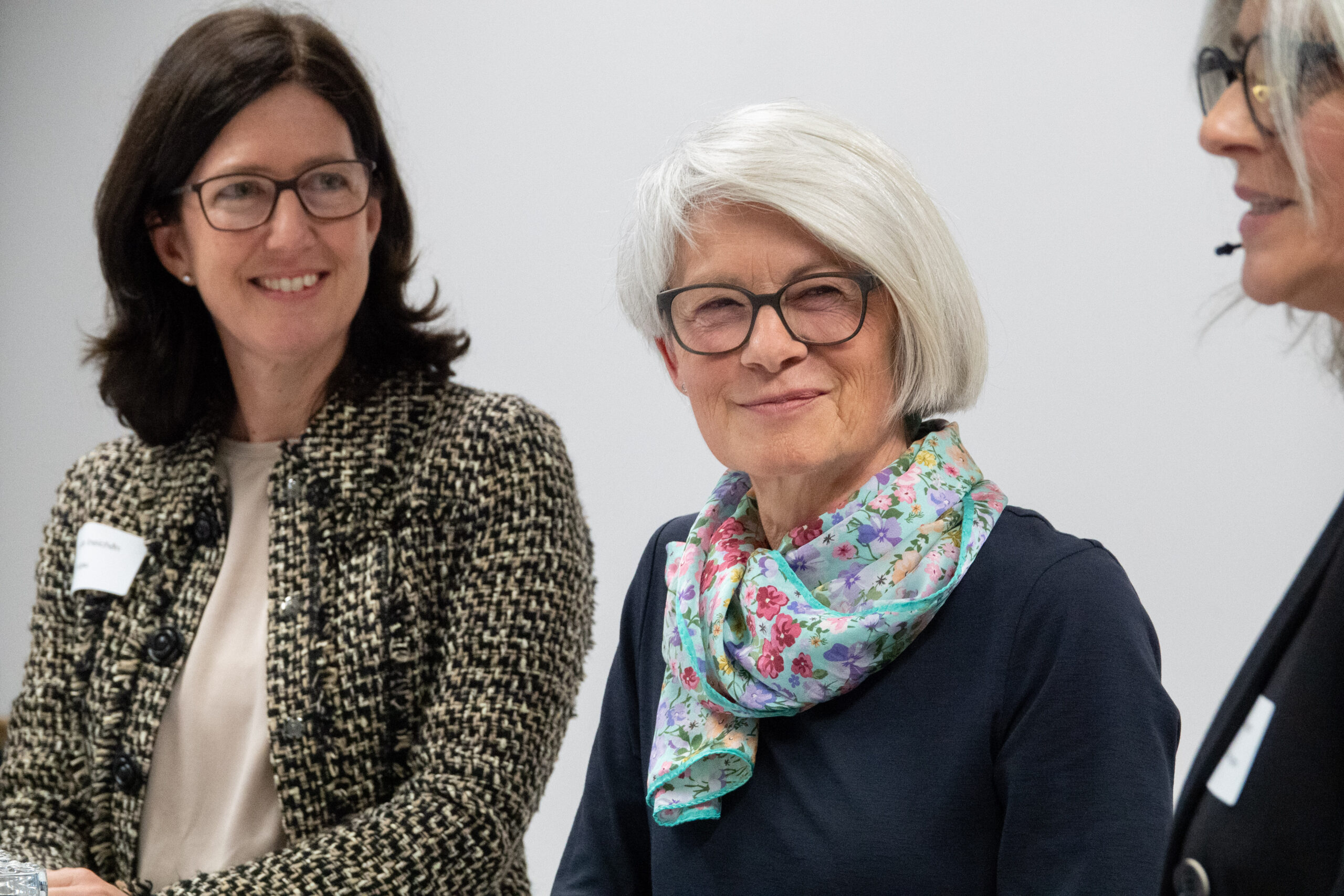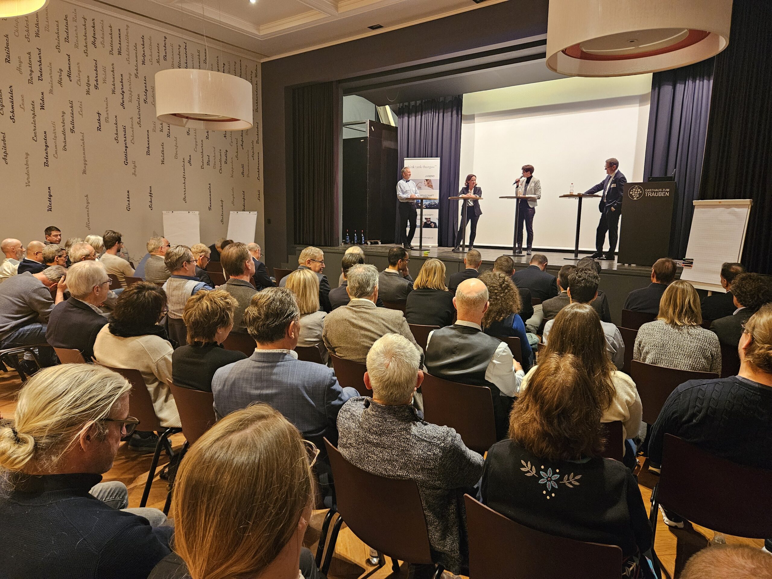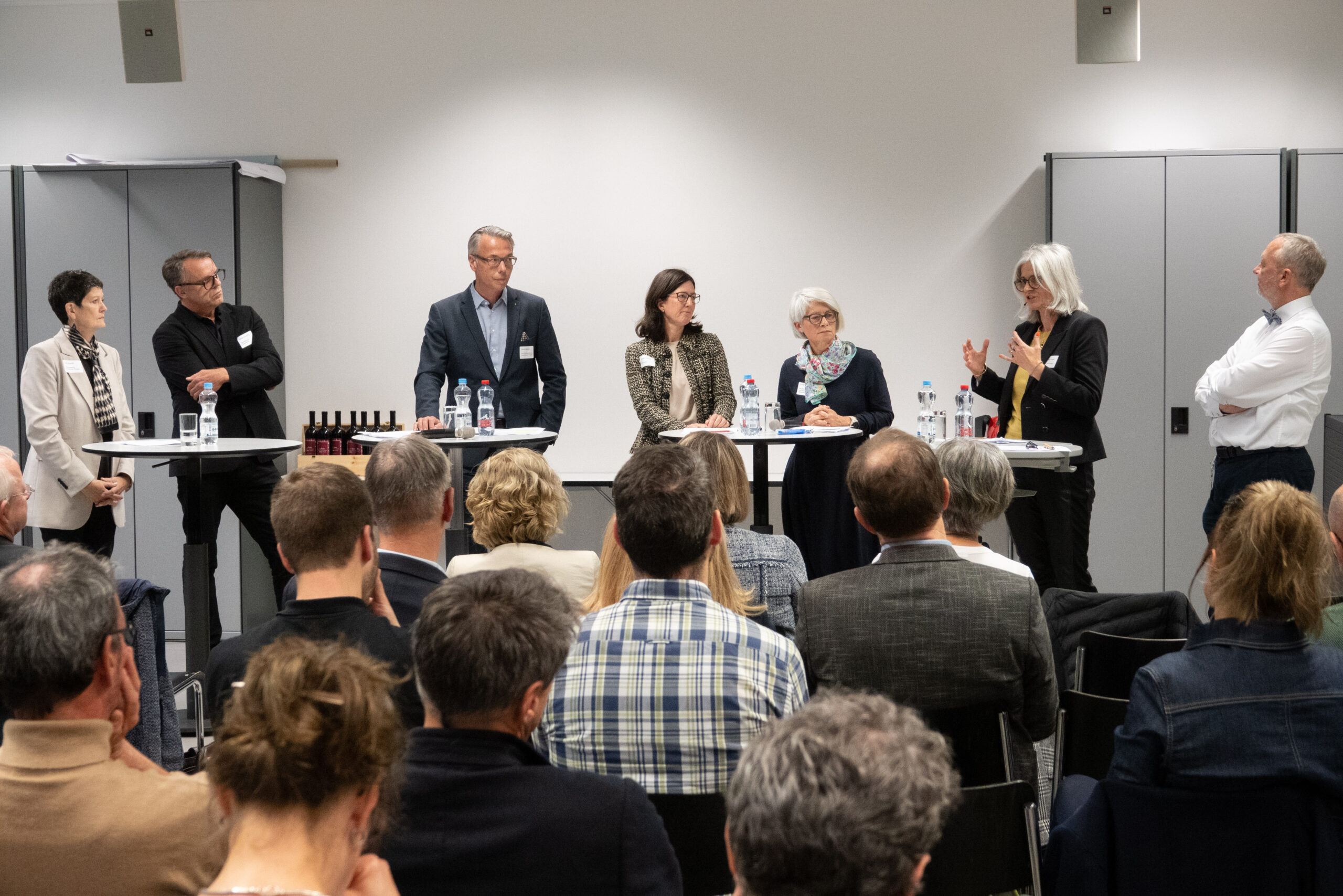 In der abschliessenden Podiumsdiskussion stellten die beiden Moderatoren Stiftungsrat Prof. Dr. Thomas Merz und Stiftungsrätin Kris Vietze die Frage nach dem Verhältnis zwischen Mensch und künstlicher Intelligenz. Prof. Dr. Christina aus der Au, Dozentin an der PHTG und Präsidentin des evangelischen Kirchenrats des Kanton Thurgau plädierte für einen menschenzentrierten Blick, bei dem der Mensch steuert und die Technik für sich nutzbar macht. Auch für Prof. Dr. Michael Grossniklaus ist es zentral, dass es einen gesellschaftlichen Diskurs darüber gibt, wohin die Reise gehen soll und wie der Weg dorthin aussehen soll. Die Digitalisierung und auch die Weiterentwicklung von künstlicher Intelligenz lässt sich nicht aufhalten, wichtig ist es, sie bewusst und menschlich zu gestalten. Die lebhafte Diskussion mit dem Publikum zeigte, wie wichtig das Thema ist und dass es jede und jeden betrifft. Es wurde aber auch deutlich, dass es oftmals unterschiedliche Definitionen und Vorstellungen gibt, was unter Digitalisierung und insbesondere künstlicher Intelligenz verstanden wird.