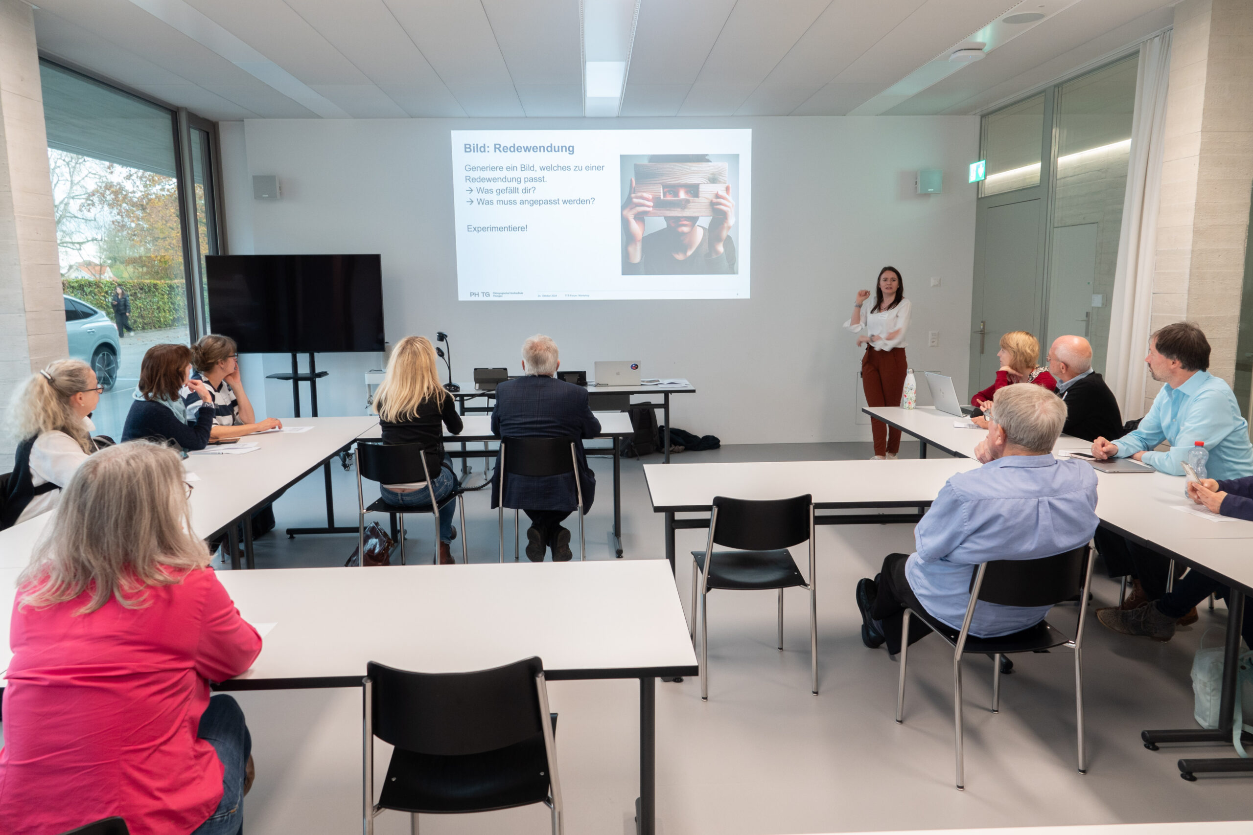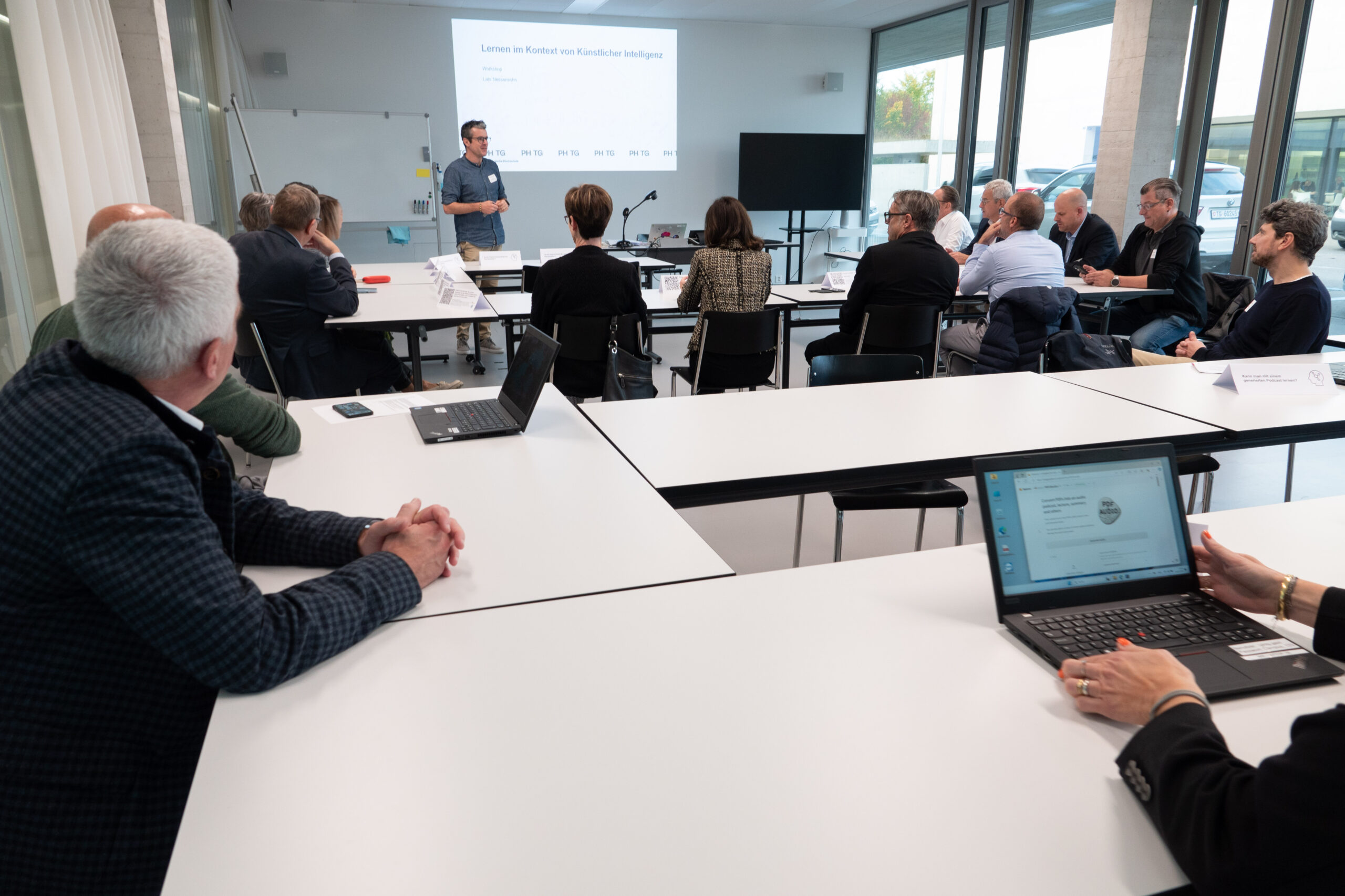 Expertinnen und Experten der Fachstelle Schule und Digitalität der PHTG zeigten anschaulich, wie man mit Hilfe von Künstlicher Intelligenz Texte, Bilder, Videos und Musik erstellen kann. Informations- und Medienkompetenz ist im Umgang mit KI entscheidend, um Fakten von Fakes zu unterscheiden. «Hierzu braucht es überfachliche Kompetenzen, die im Sinne ganzheitlicher Bildung in Schulen vermittelt werden müssen», betonte Stefan Schneider, Rektor der Kantonsschule Romanshorn, in der von Regula Broger und Thomas Merz moderierten Podiumsdiskussion. «Studierfähigkeit und Gesellschaftsreife schaffen eine Anschlussfähigkeit an das Berufsleben.» Pascale Ineichen, stv. Direktorin der IHK Thurgau und Leiterin Wirtschaftspolitik und Kommunikation machte deutlich, dass KI ein grosses Potenzial für die Wirtschaft hat. Neben fachlichen werden jedoch auch die überfachlichen Kompetenzen zukünftig noch stärker gefragt sein. Dies unterstrich auch Daniel Wessner, Leiter des Amts für Wirtschaft und Arbeit des Kanton Thurgau. Die Berufsbilder werden sich weiter verändern, heute lasse sich nur schwer abschätzen, wie die Arbeitswelt zukünftiger Generationen aussehe. Stellensuchende im Bereich KI fit zu machen, sei ein zentrales Anliegen.