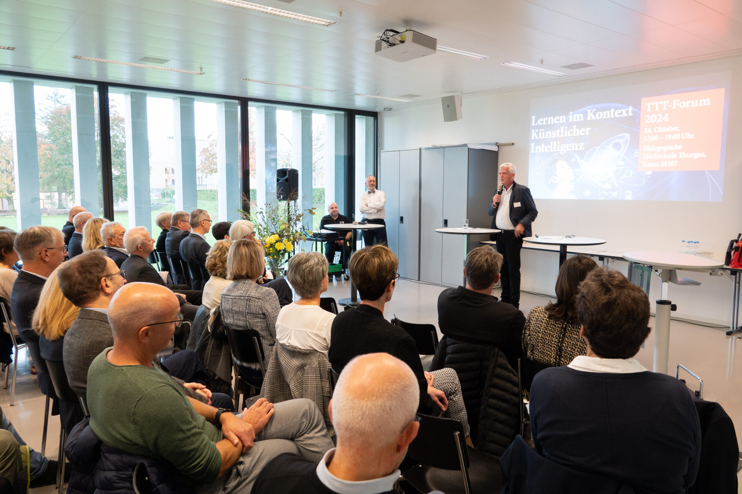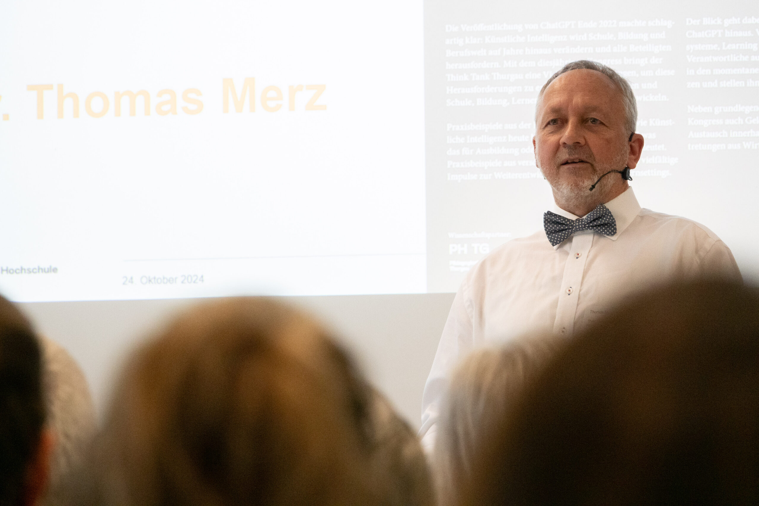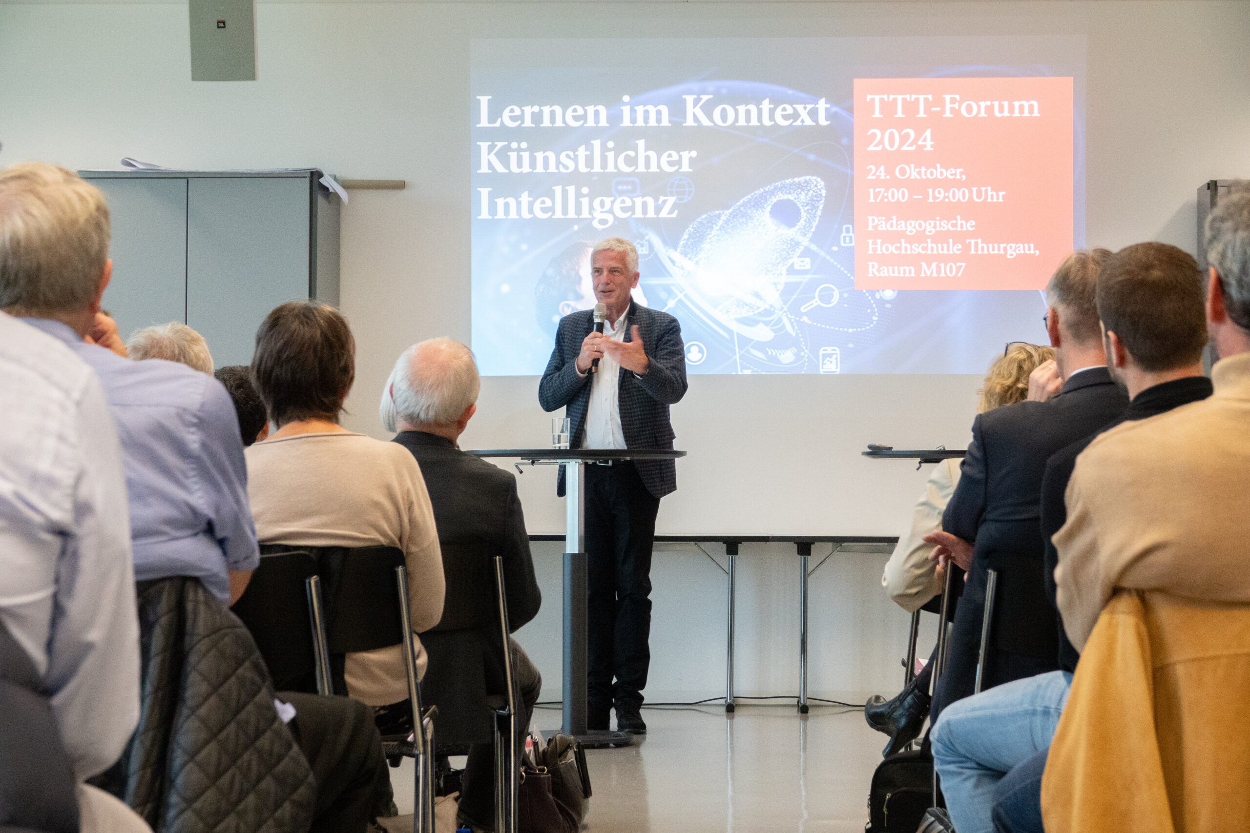 Rund 60 Interessierte aus Schulen, Bildung, Politik und Verwaltung waren der Einladung von Think Tank Thurgau zum TTT-Forum an die Pädagogische Hochschule Thurgau in Kreuzlingen gefolgt. Das TTT-Forum will die Ergebnisse des vorangegangen Wissenschaftskongresses aufgreifen und nutzbar machen. In seiner Begrüssung betonte Stiftungsratspräsident Matthias Mölleney, dass in Schulen die Voraussetzungen für einen verantwortungsvollen Umgang mit KI geschaffen werden müssten. Das gelinge nur, wenn man offen für Veränderungen ist und flexibel bleibe: «Wenn Du denkst, du hast alles unter Kontrolle, bist Du zu langsam – das gilt auch für KI». Prof. Dr. Thomas Merz, Prorektor Forschung und Wissensmanagement und Stiftungsrat beim Think Tank Thurgau fasste die Ergebnisse des Wissenschaftskongresses zum Thema «Lernen im Kontext Künstlicher Intelligenz», der im Juni 2024 in Frauenfeld stattfand, zusammen. Er betonte, dass es ein neues Verständnis des Lehrens und Lernens brauche: «Das beinhaltet innovative Lernsettings, neue Formen der Lernkontrolle und ein hohes Mass an Motivation und Eigenverantwortung der Lernenden».