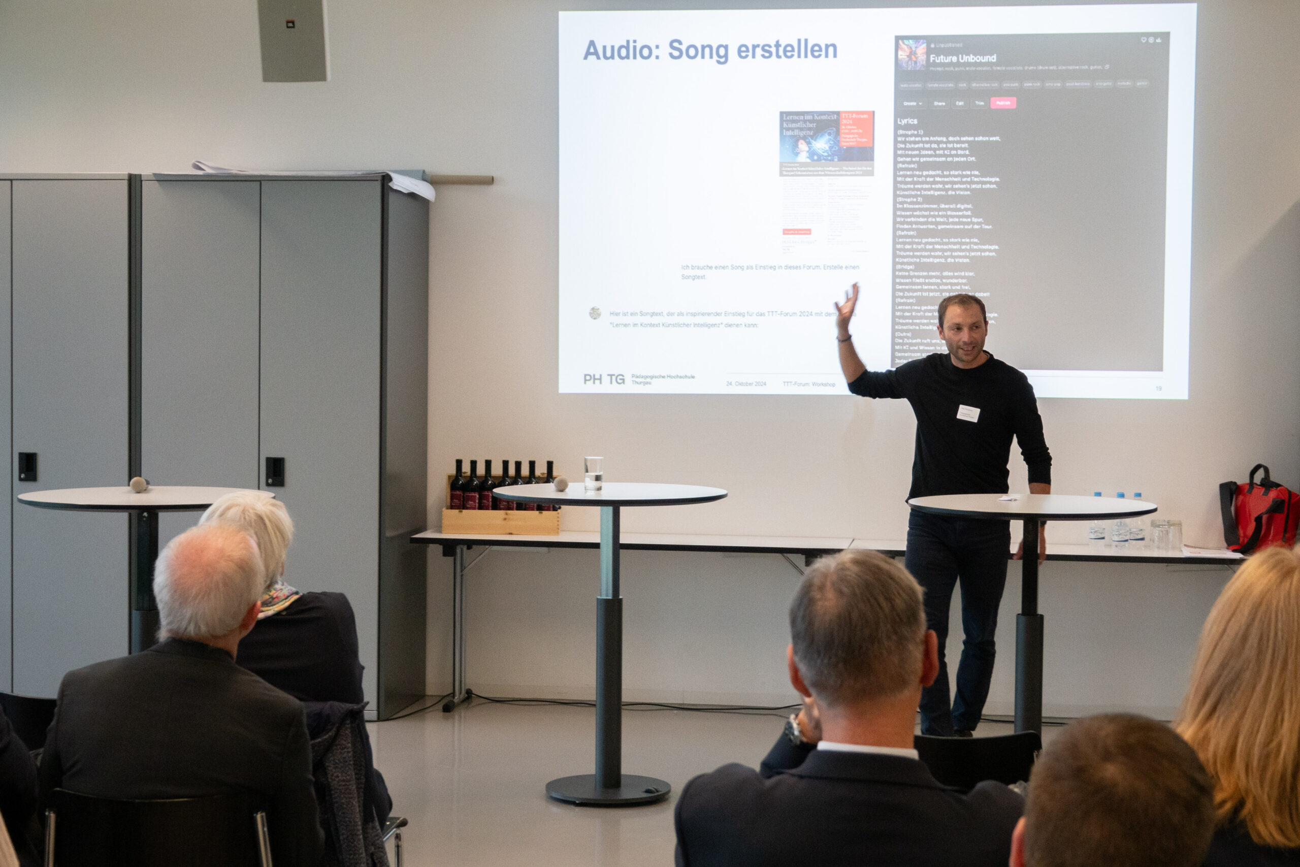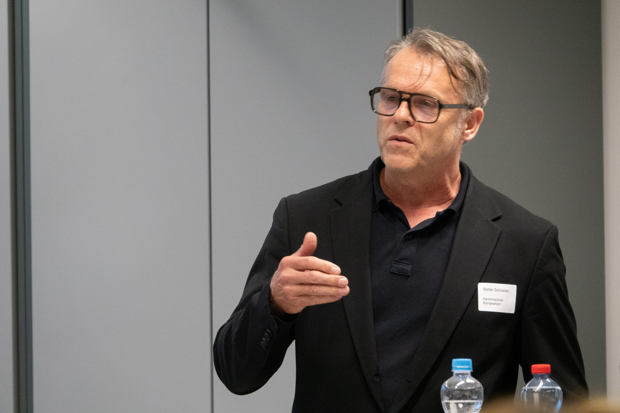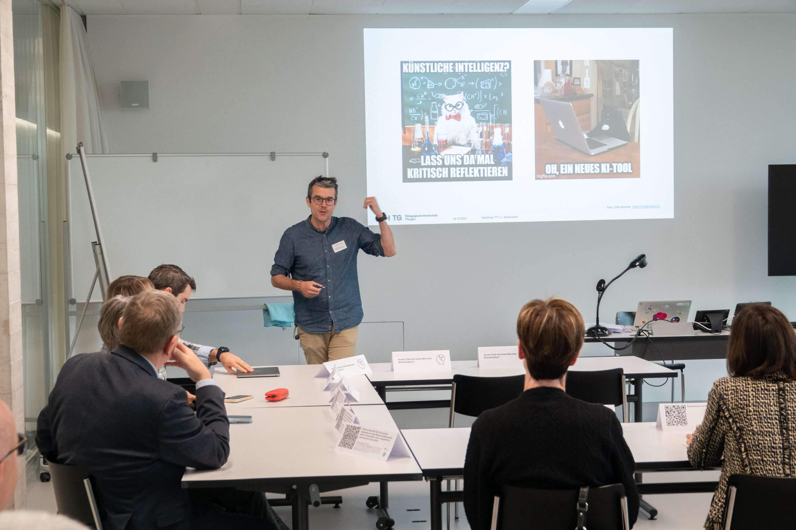 Rund 60 Interessierte aus Schulen, Bildung, Politik und Verwaltung waren der Einladung von Think Tank Thurgau zum TTT-Forum an die Pädagogische Hochschule Thurgau in Kreuzlingen gefolgt. Das TTT-Forum will die Ergebnisse des vorangegangen Wissenschaftskongresses aufgreifen und nutzbar machen. In seiner Begrüssung betonte Stiftungsratspräsident Matthias Mölleney, dass in Schulen die Voraussetzungen für einen verantwortungsvollen Umgang mit KI geschaffen werden müssten. Das gelinge nur, wenn man offen für Veränderungen ist und flexibel bleibe: «Wenn Du denkst, du hast alles unter Kontrolle, bist Du zu langsam – das gilt auch für KI». Prof. Dr. Thomas Merz, Prorektor Forschung und Wissensmanagement und Stiftungsrat beim Think Tank Thurgau fasste die Ergebnisse des Wissenschaftskongresses zum Thema «Lernen im Kontext Künstlicher Intelligenz», der im Juni 2024 in Frauenfeld stattfand, zusammen. Er betonte, dass es ein neues Verständnis des Lehrens und Lernens brauche: «Das beinhaltet innovative Lernsettings, neue Formen der Lernkontrolle und ein hohes Mass an Motivation und Eigenverantwortung der Lernenden».