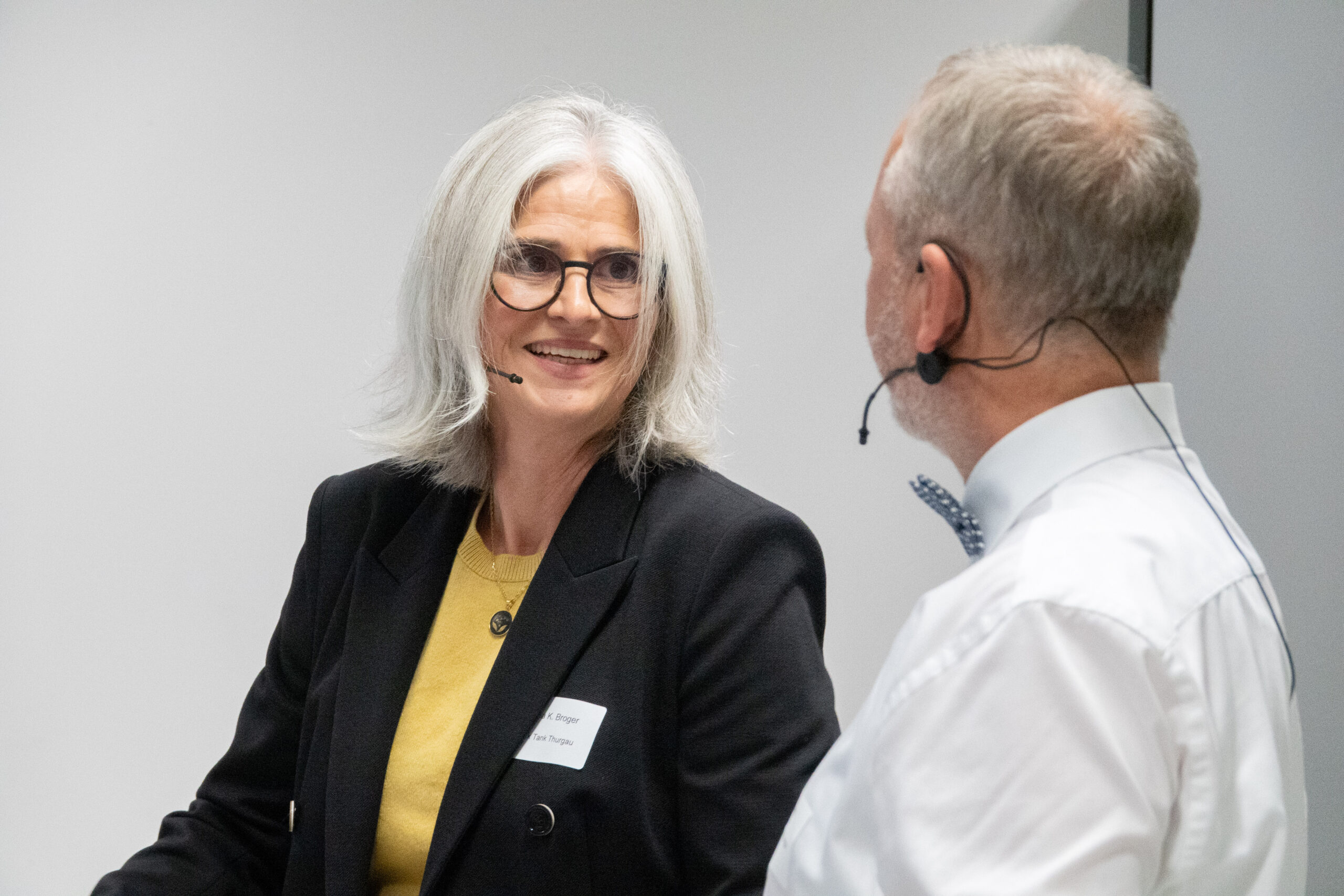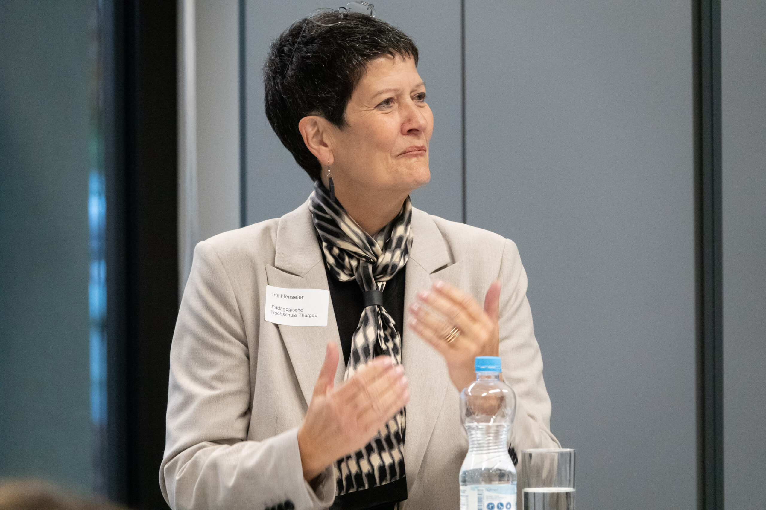 Aber sind wir auch als Gesellschaft parat für den Einsatz von Künstlicher Intelligenz? Was sind die Rahmenbedingungen, welche ethischen Fragen stellen sich und wer reguliert was? Iris Henseler, Prorektorin Weiterbildung und Dienstleistungen der PHTG, plädierte für die Offenheit, Experimente zuzulassen, Verantwortung zu übernehmen und eine kritische Haltung zu entwickeln. Brigitte Kaufmann, Kommunikationsberaterin und Präsidentin der Berufsfachschulkommission des Bildungszentrum für Wirtschaft Weinfelden warnte davor, dass bereits heute bestimmte Bevölkerungsgruppen abgehängt werden. Sie verwies auf die wachsende Zahl älterer Menschen, deren Zugang zu technischen Entwicklungen meist mit Austritt aus dem Berufsleben erschwert werde. Darüber hinaus gebe es weitere Personengruppen, die aus unterschiedlichen Gründen, nicht partizipieren könnten. Hier seien Sensibilität und eine gesamtgesellschaftliche Verantwortung gefragt, um den Umgang mit und den Einsatz von Künstlicher Intelligenz offen, transparent und zugänglich zu gestalten. Denn Künstliche Intelligenz wird da eingesetzt, wo wir ersetzbar sind. Für das, was das Menschsein ausmacht, bleiben der direkte Kontakt und die zwischenmenschliche Interaktion unersetzbar.